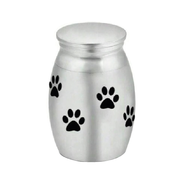 Urna metálica pequeña, ideal para conservar el recuerdo de tu mascota. Con diseño de huellas de patitas lleva siempre contigo a tu compañero inolvidable. Exclusivo para mascotas exóticas pequeñas.